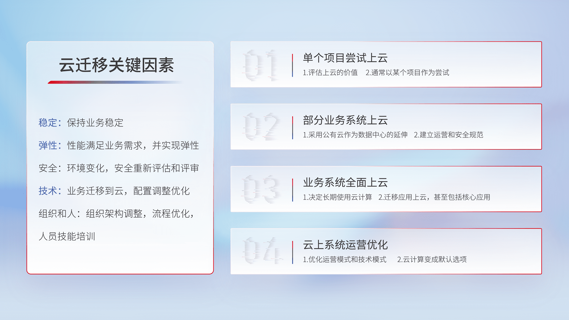 结合实际业务,,,从规划设计、、、云平台选型、、、云原生改造、、、、数据迁移、、、集成交付,,迁移全过程为客户识别最佳上云路径,,做好风险识别管理,,,,设计网络架构、、、身份权限、、安全审计合规、、操作审计、、、、日志审计、、、、监控告警策略、、、、多站点容灾设计等,,,,对云上基础设施进行整体规划,,提升IT治理水平,,,,以满足弹性、、、、高可用、、、高性能的需求。。。